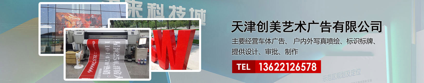 天津創(chuàng)美藝術(shù)廣告有限公司主要經(jīng)營車體廣告、 戶內(nèi)外寫真噴繪、標識標牌、提供設計、審批、制作、發(fā)布的服務。